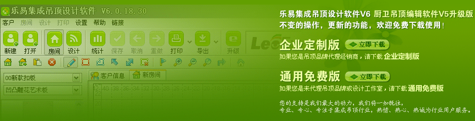 樂易集成吊頂設(shè)計(jì)軟件V6可以在本站上免費(fèi)下載安裝,我們非常希望您能把使用過程中的問題、意見、建議及時(shí)反饋給我們,以便我們不斷完善和升級軟件。